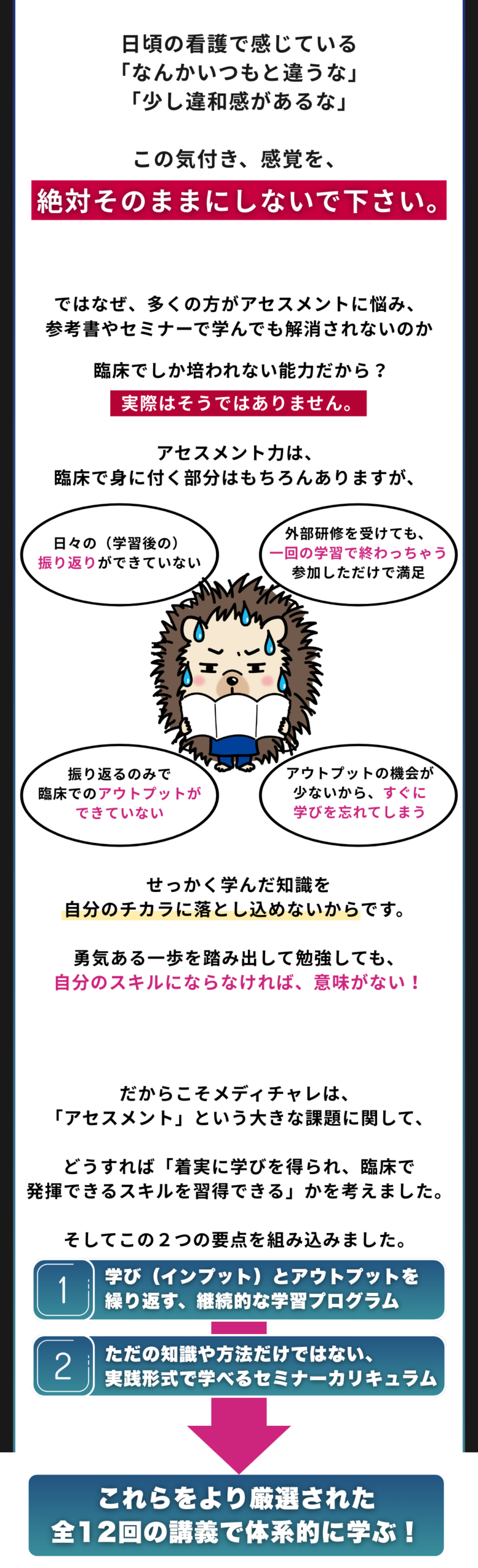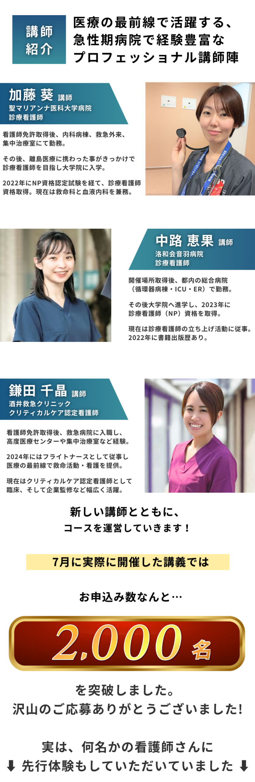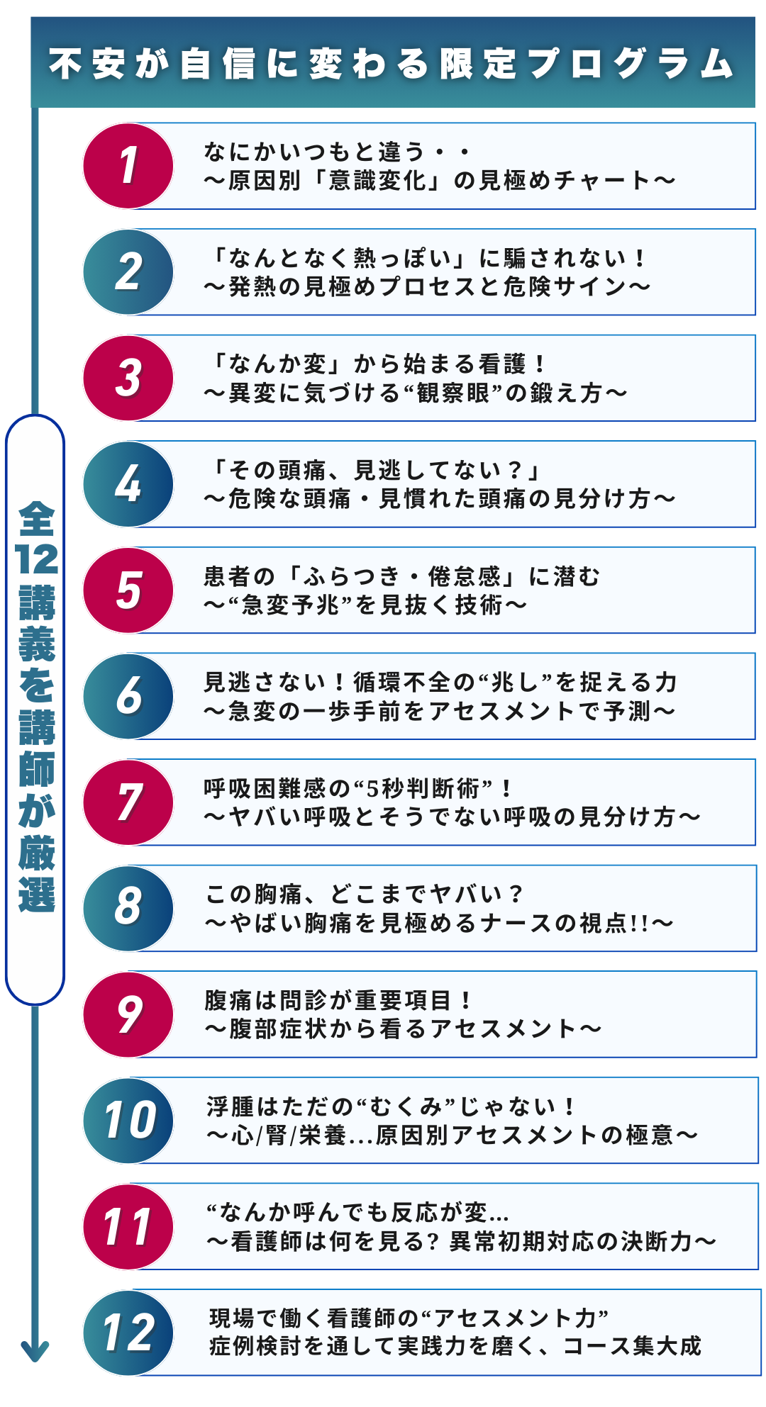 また、今までのコースセミナーでも、看護師以外に学生や他職種の医療職者など多数参加いただいておりますので、お気軽にご参加ください。